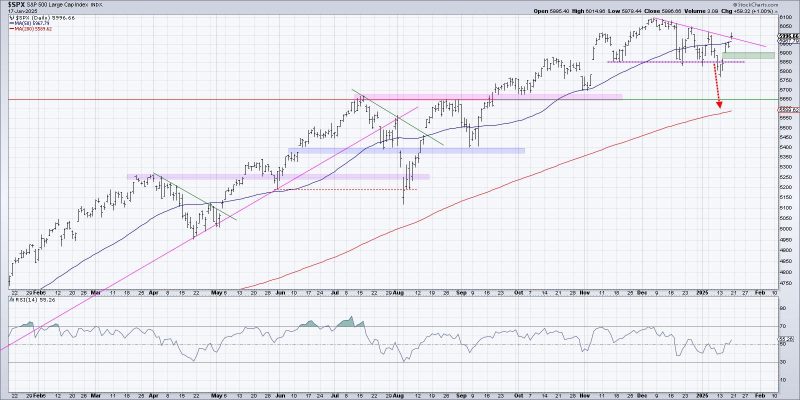 We always have to consider the doomsday scenario, where conditions deteriorate much more quickly than expected. Earnings season is a bust, Trump’s new administration lights up tariffs, and inflationary fears lead to low confidence in the Fed’s ability to take decisive action. The S&P 500 pushes down to the 200-day moving average, and after a brief bounce, drops down to around 5500 by the end of February.