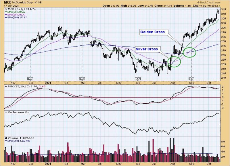 At DecisionPoint, we track intermediate-term and long-term BUY/SELL signals on twenty-six market, sector, and industry group indexes. The long-term BUY signals are based upon the famous Golden Cross, which is when the 50-day moving average crosses up through the 200-day moving average. (We use exponential moving averages — EMAs.) Intermediate-term BUY signals are based upon the 20-day moving average crossing up through the 50-day moving average, which we call a Silver Cross. On the McDonalds (MCD) chart below, you can see examples of each.
