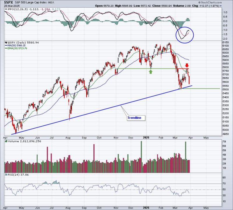 The S&P 500, from its recent all-time high to its subsequent low, fell 10.4%, which marks correction territory. The rally we saw off the March 13th low was likely due to oversold conditions, along with March options expiration. On Tuesday, March 18th, we discussed with our EB.com members that odds favored a short-term rally, based on max pain and we laid out key resistance from 5670 to 5782, with the 20-day EMA falling in the middle of this price range. Once we failed at 5782, it was very important to gauge the nature of any new selloff. That’s what I’ve been evaluating this week and it’s not pretty. As you can see in the chart above, money has once again started rotating into the XLP and out of the XLY. This is one of the most important intermarket relationships and it’s screaming BEARISH ACTION AHEAD!